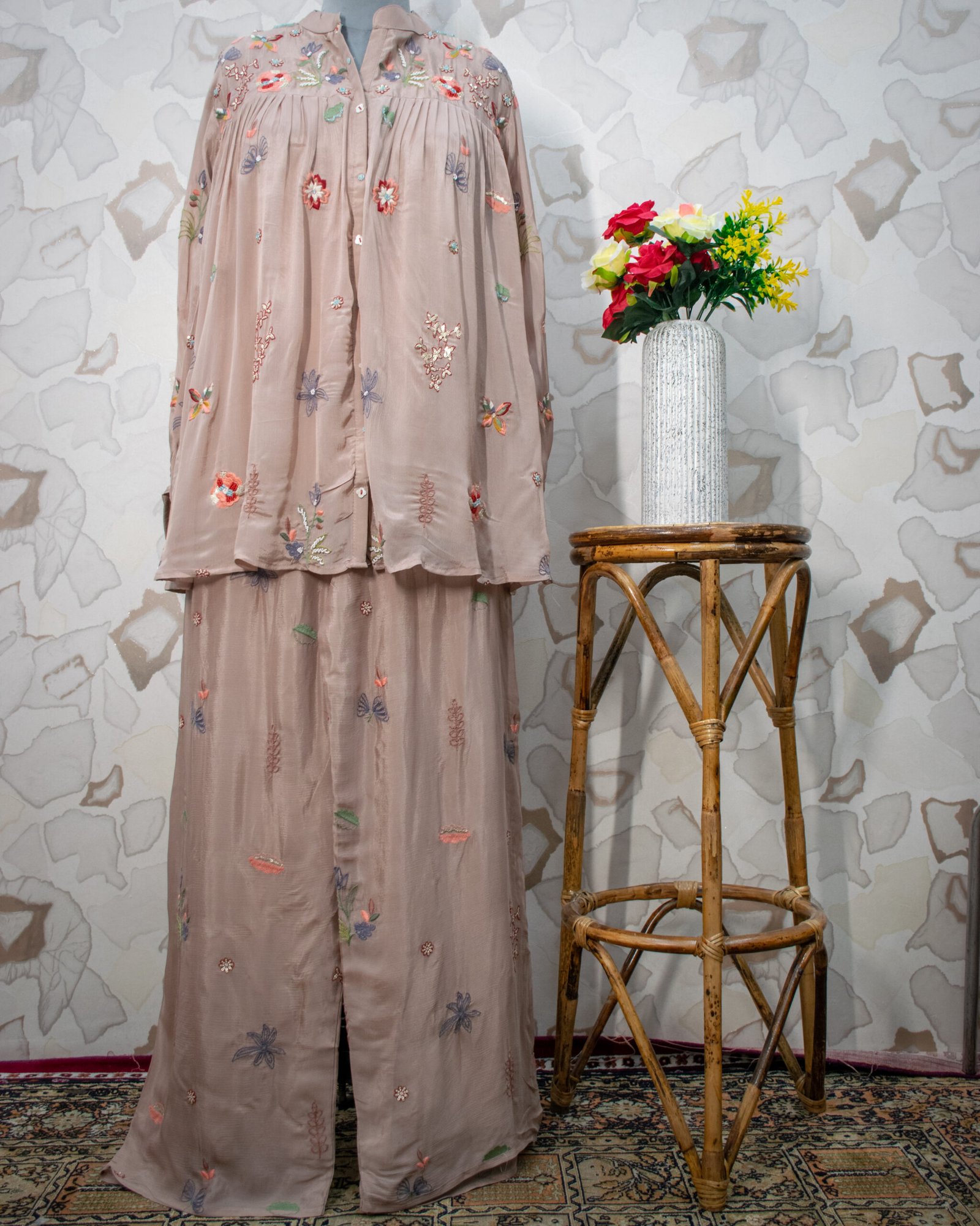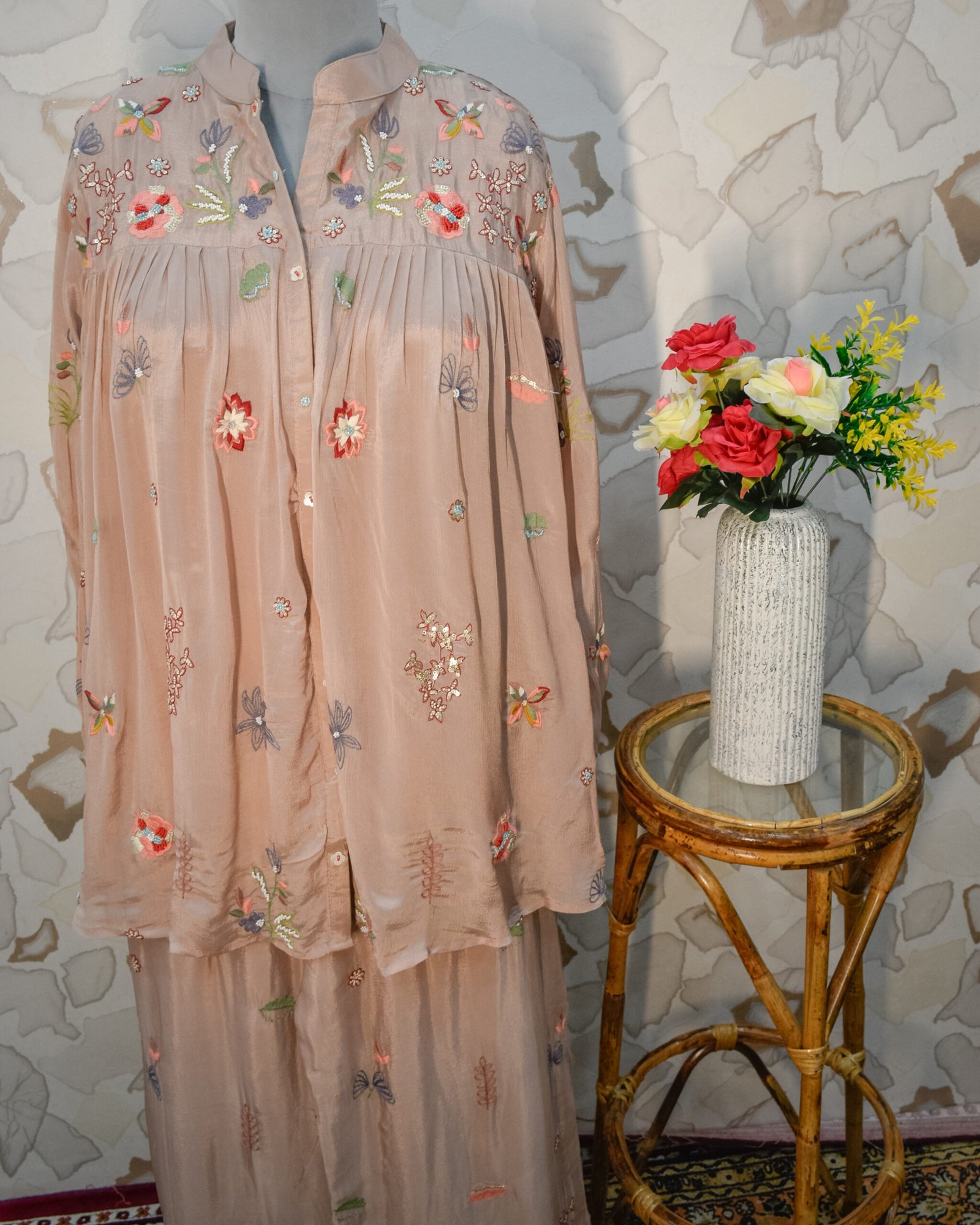 This chic look is perfectly paired with matching wide-leg palazzos, which also feature cohesive floral embroidery cascading down the legs. Because this is a hassle-free 2-piece set, it requires zero effort to style while ensuring you look incredibly put-together from morning to night.