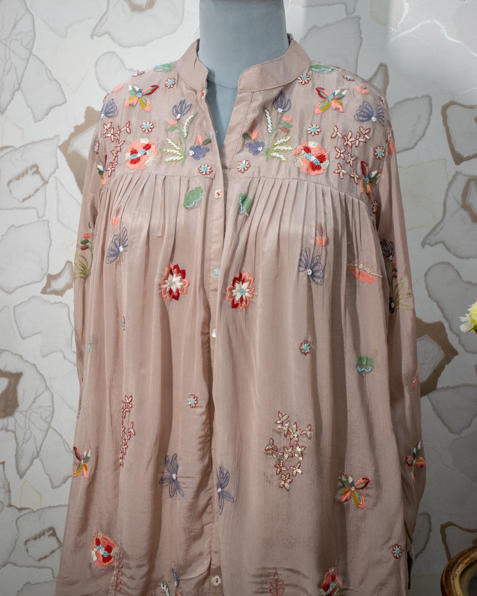 The top features a sophisticated mandarin collar that leads into a functional button-down front. It is beautifully designed with soft gathered pleats below the shoulder yoke, offering a relaxed, breathable, and highly flattering fit that drapes wonderfully. The premium fabric carries a subtle sheen, which perfectly highlights the vibrant pops of orange, blue, and green floral embroidery scattered across the bodice and sleeves.