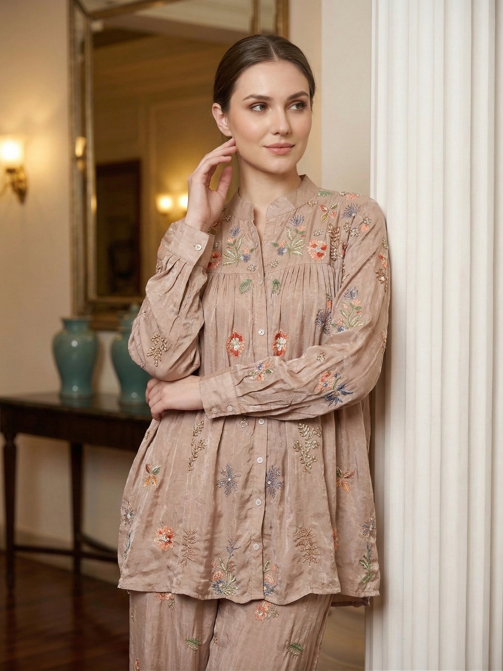 Redefine your contemporary wardrobe with our Elegant Taupe Floral Embroidered Co-ord Set. Designed for the modern woman who values both supreme comfort and high-end style, this outfit seamlessly blends western silhouettes with the charm of delicate ethnic embroidery.