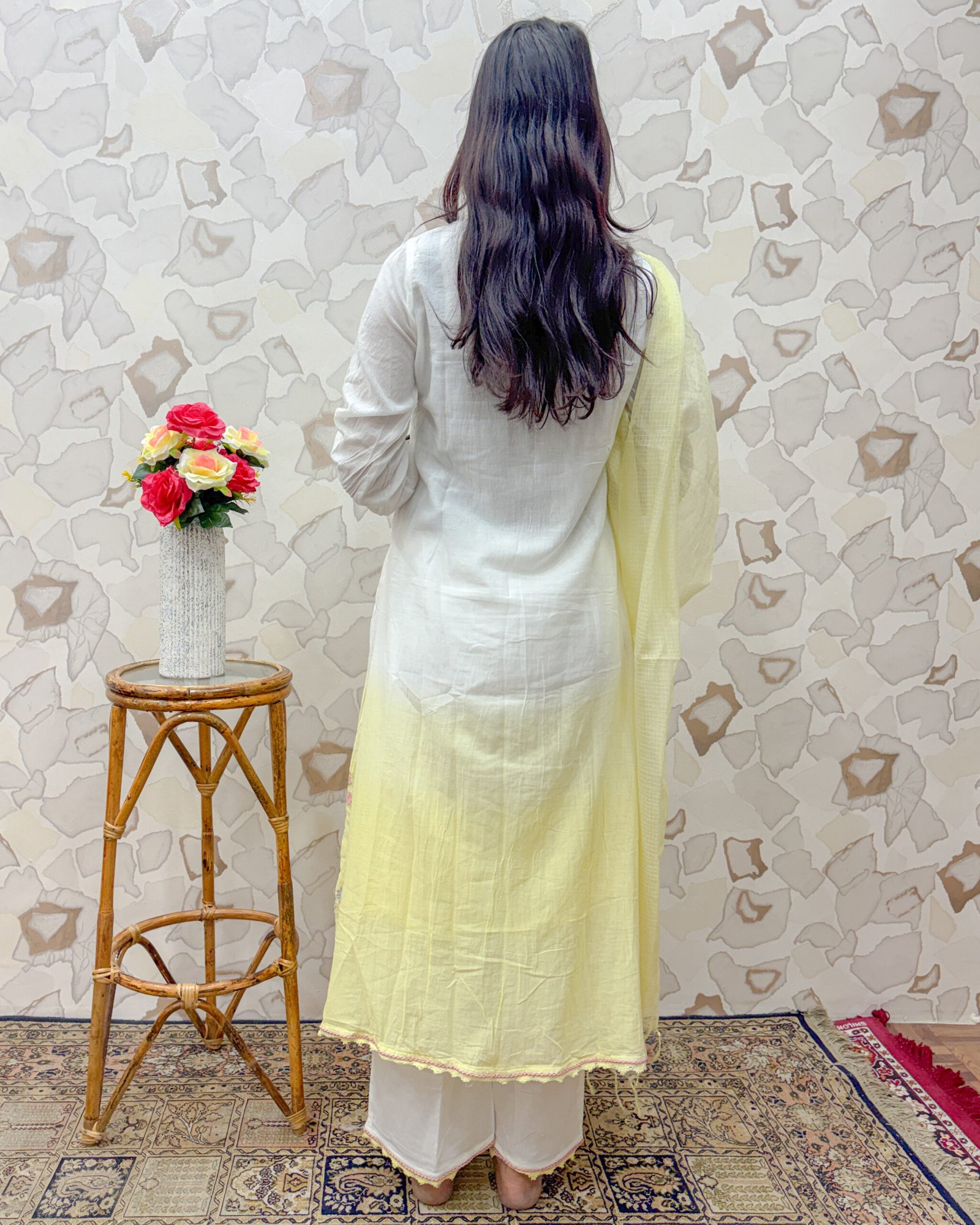 Add a breath of fresh, summery air to your everyday wardrobe with our Fresh Lemon & White Ombre Floral Embroidered Kurta Set. Designed for the modern woman who values lightweight, breathable fabrics and unique boutique-style designs, this readymade outfit perfectly balances casual comfort with elegant, eye-catching detailing.