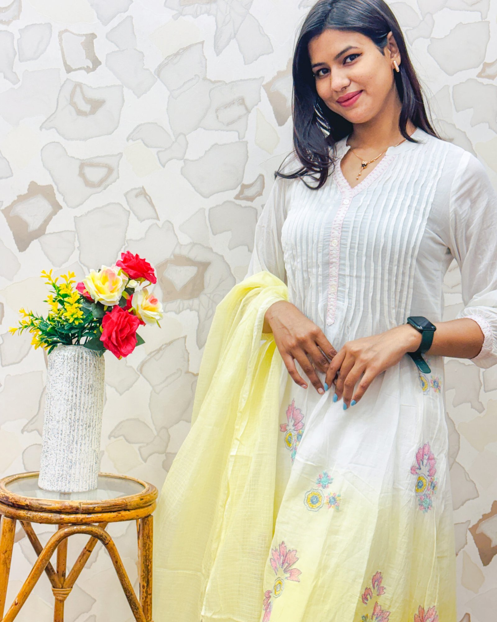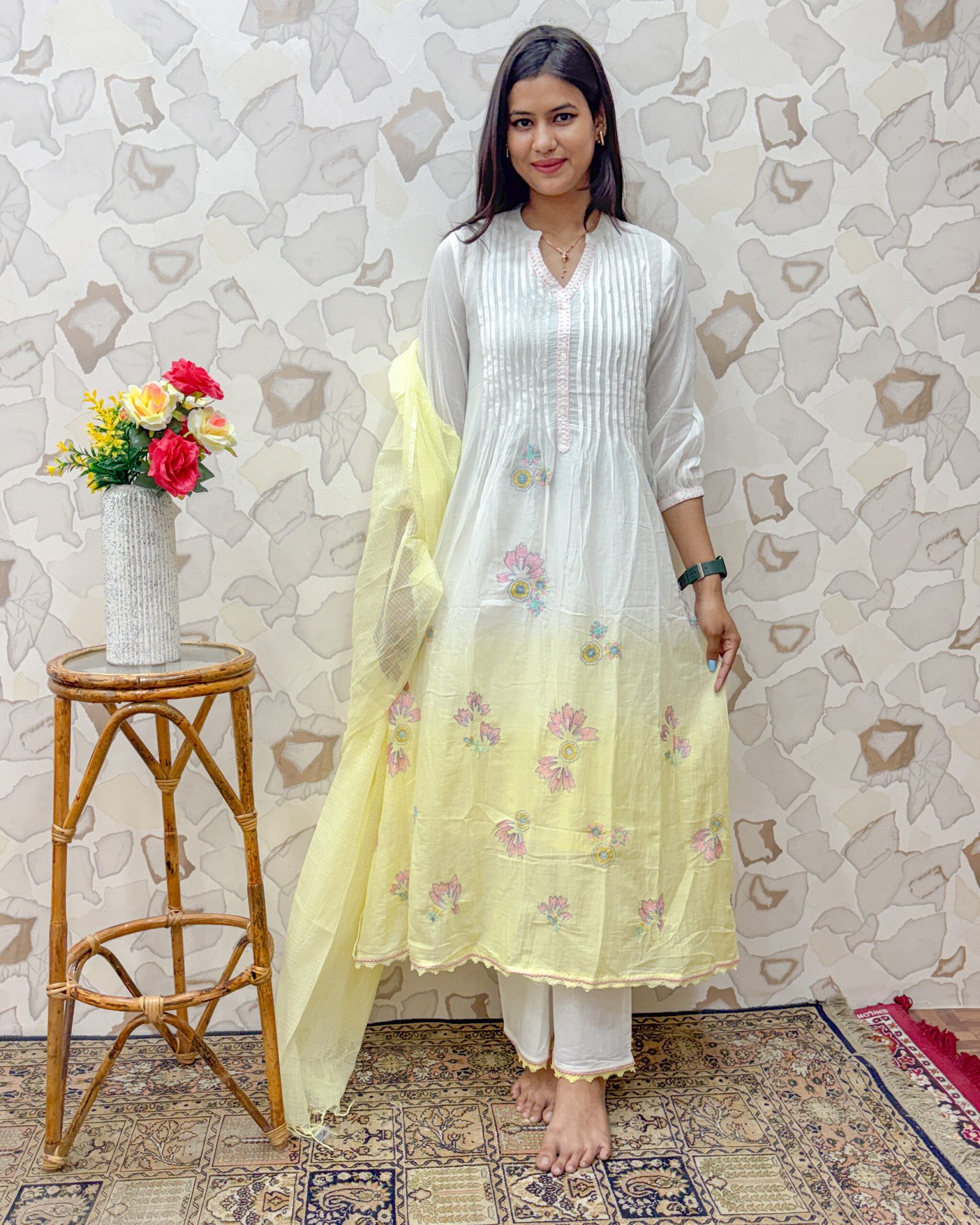 The kurta features a crisp white bodice beautifully structured with neat, sophisticated pintuck pleats, creating a highly tailored and flattering look. As the fabric flows downward into a relaxed A-line silhouette, it transitions into a gorgeous, soft lemon-yellow ombre effect. This vibrant lower half is playfully adorned with scattered pastel floral embroidery in shades of pink and blue, adding a sweet, feminine touch.