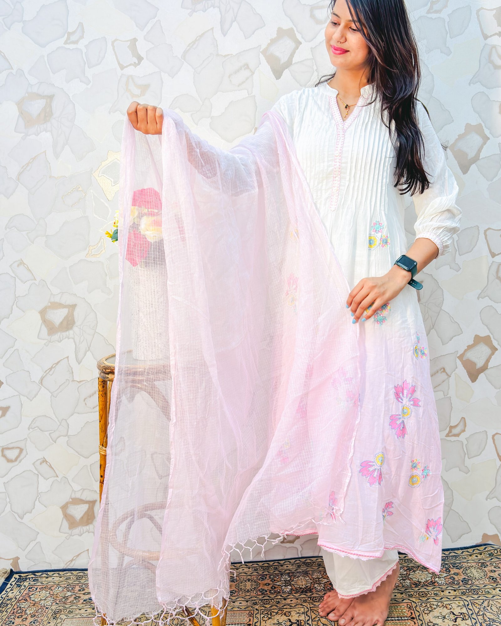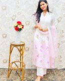 To complete this effortless look, the set includes comfortable white wide-leg palazzos finished with delicate scalloped pink hem detailing, and a beautifully textured, lightweight sheer pink dupatta that ties the whole summery aesthetic together perfectly.