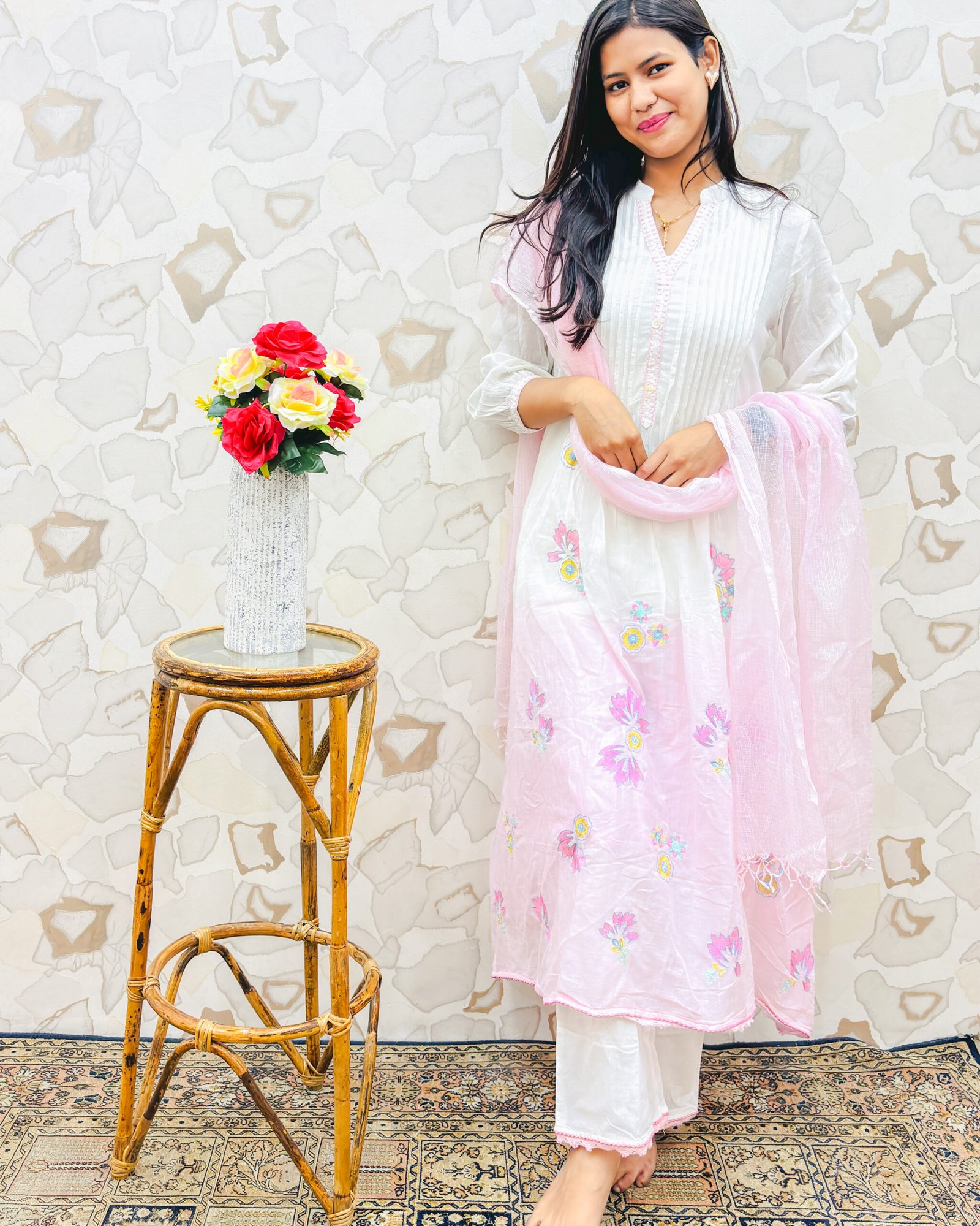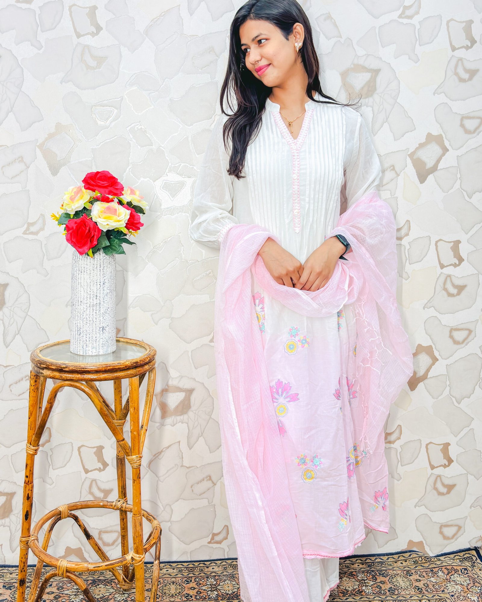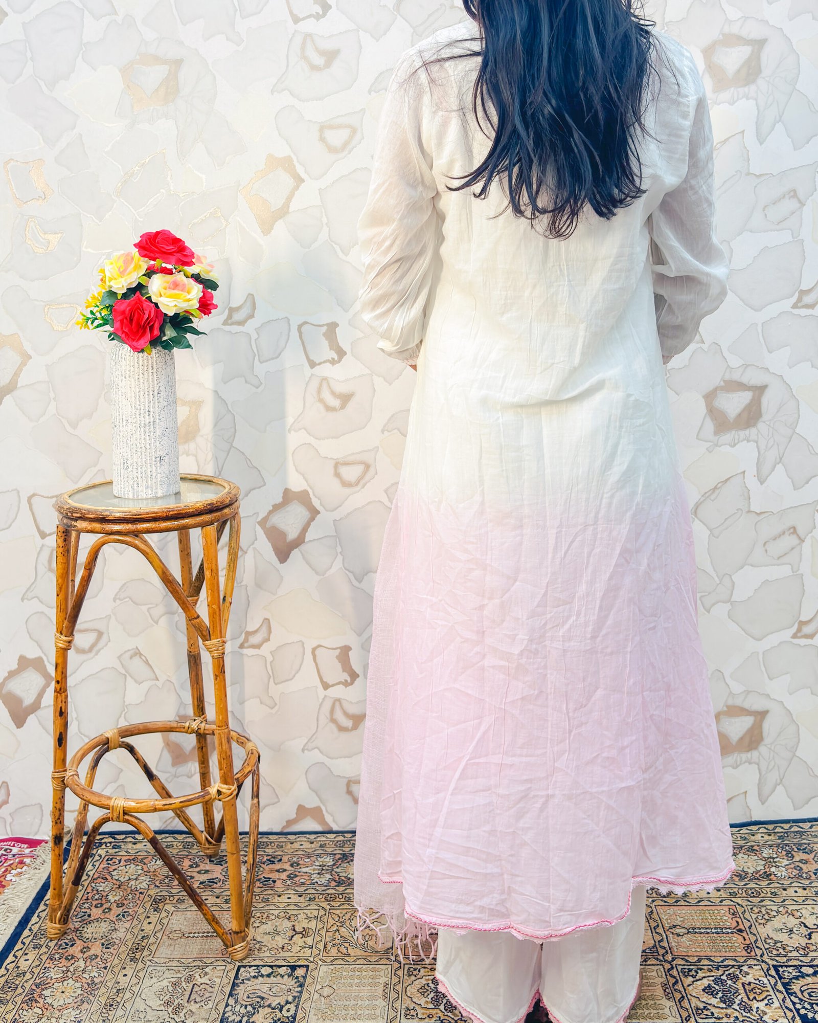 Styling Tip: The white and pink ombre is the ultimate daytime aesthetic! Pair this fresh outfit with delicate pearl studs, silver hoops, or a minimalist silver watch. Slide into comfortable white strappy sandals, flats, or traditional embroidered juttis, and finish the look with a soft pink lip color and loose waves for a flawless, breezy vibe.
