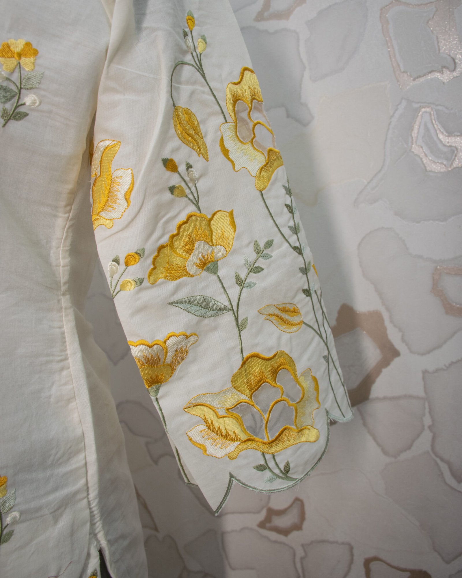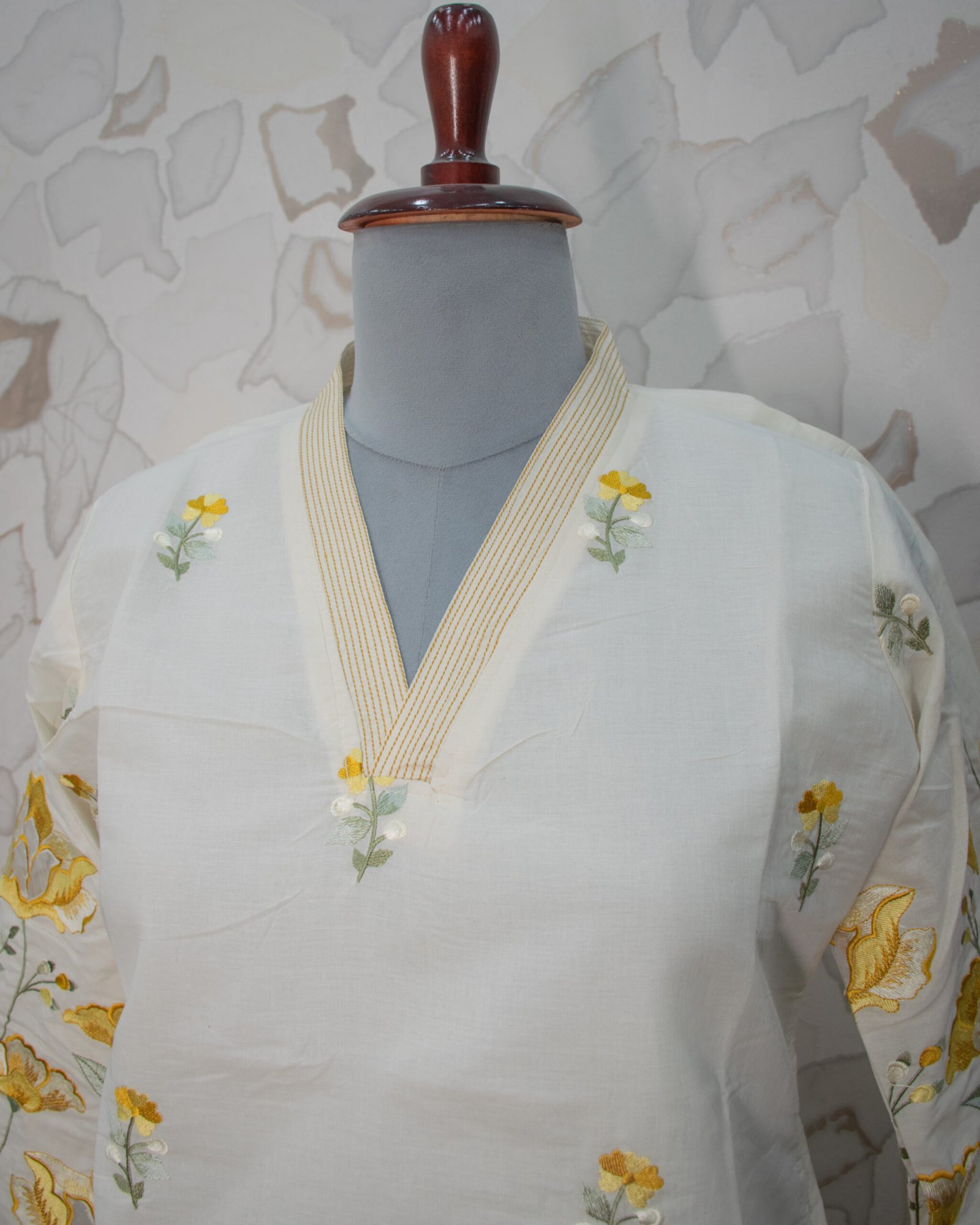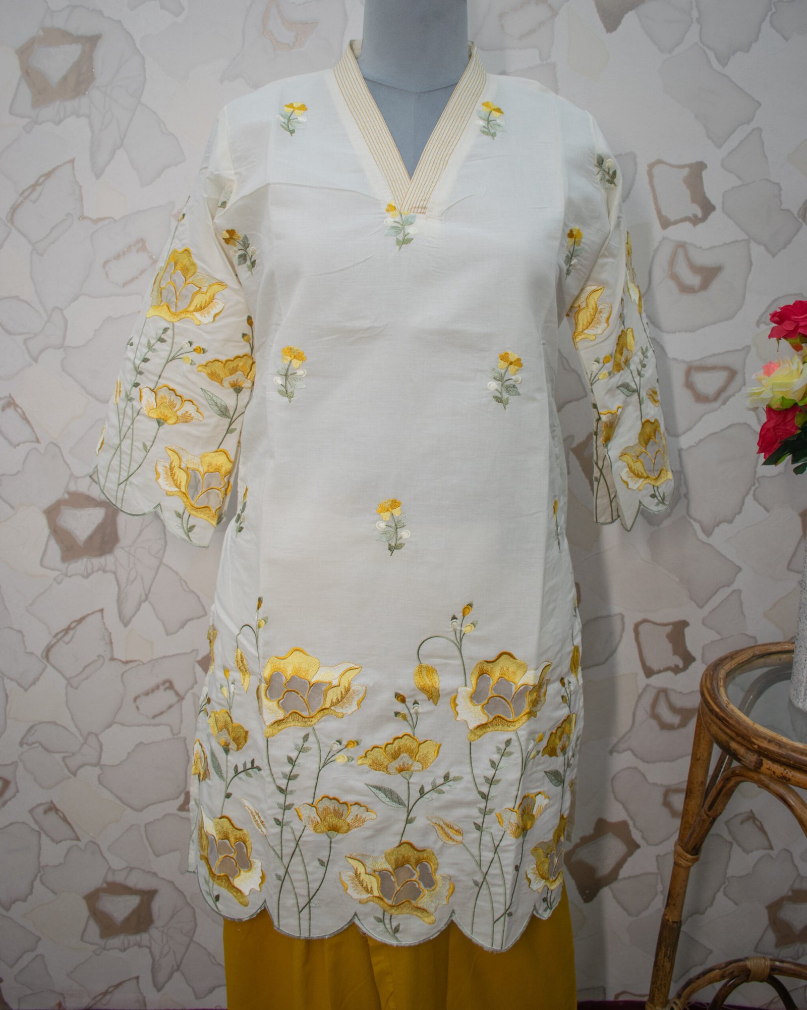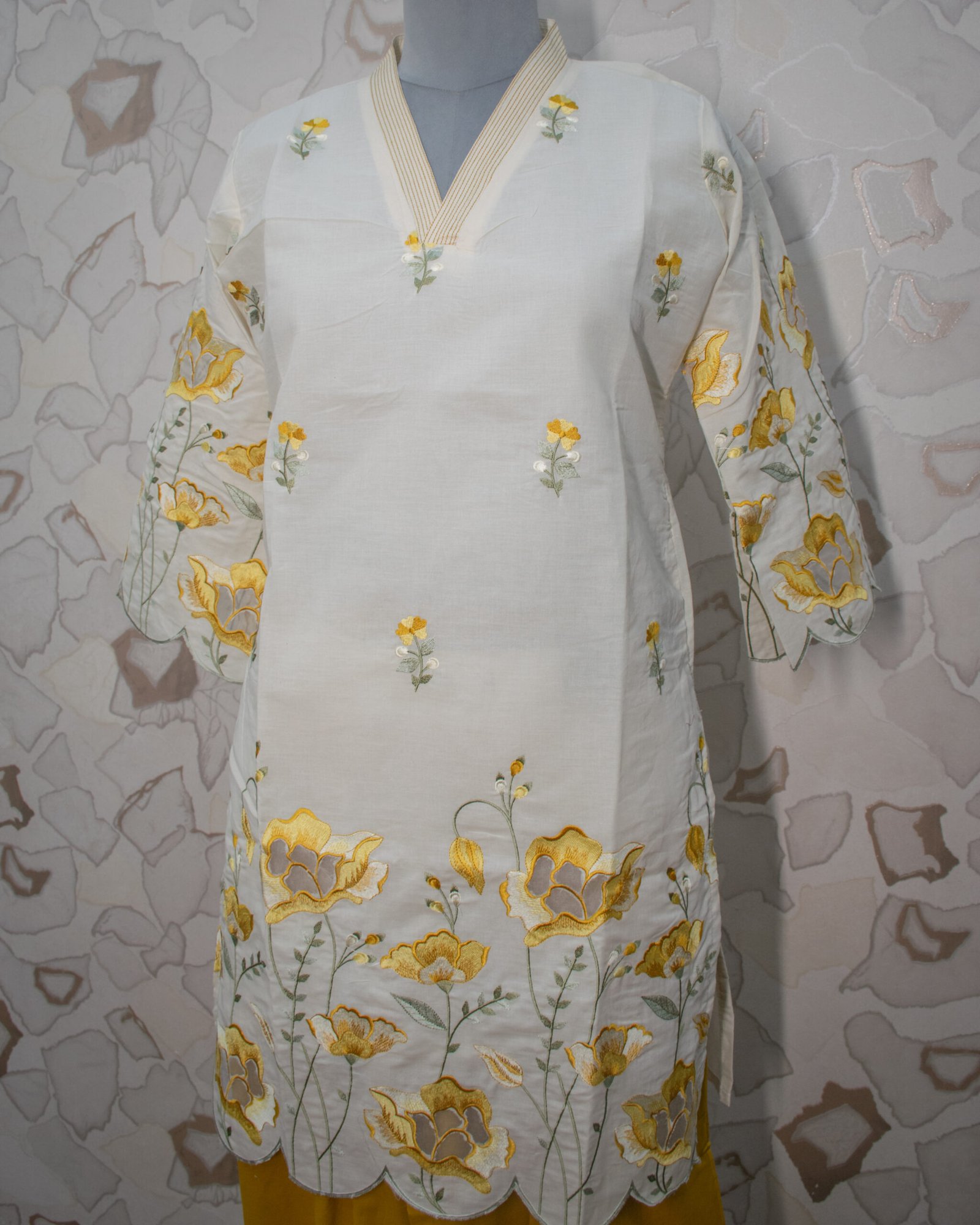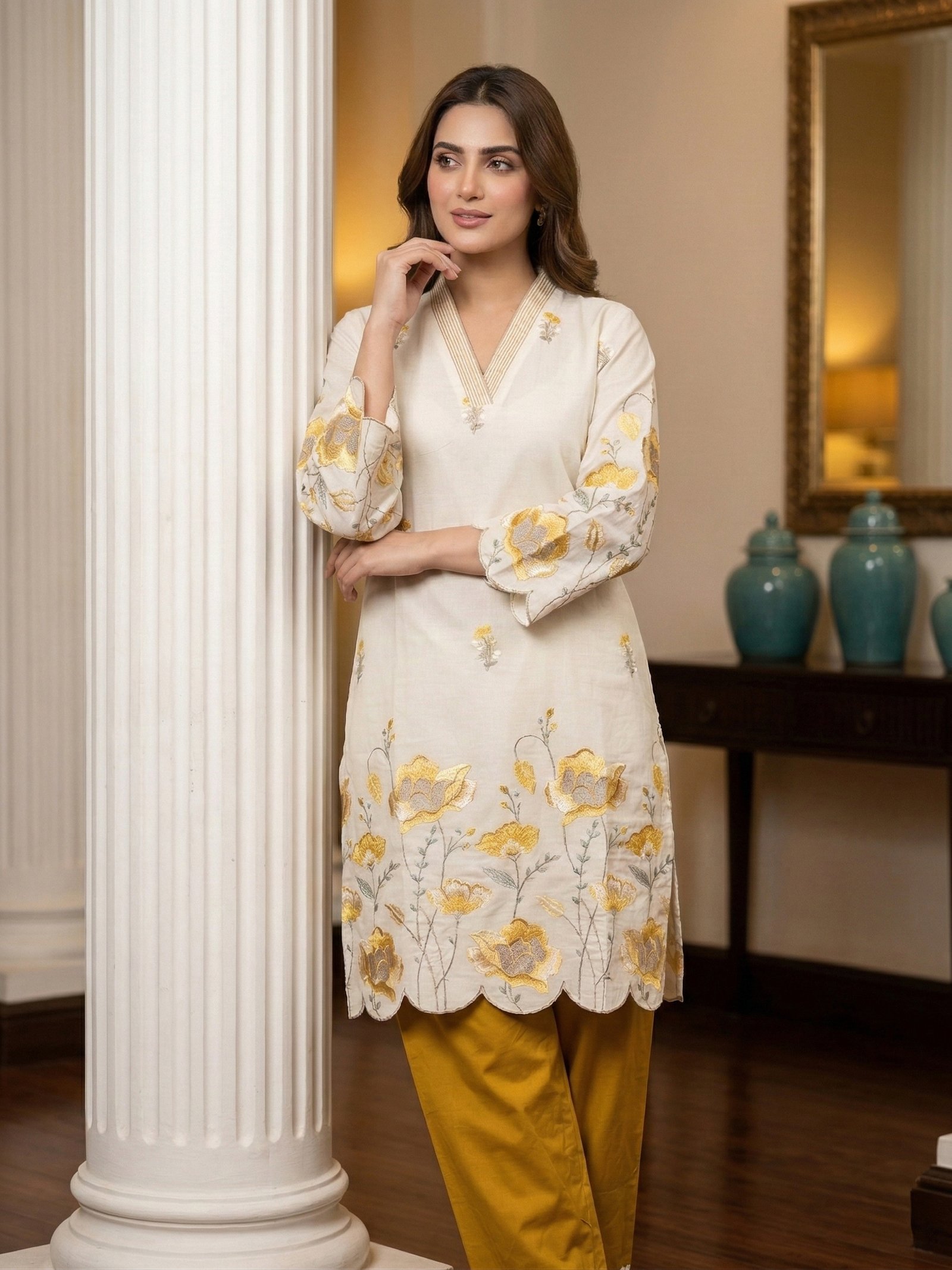 The focal point of the ivory tunic is the exquisite, large-scale floral threadwork in rich mustard and golden tones that beautifully grows upward from the hemline. This striking embroidery is perfectly complemented by premium scalloped (cutwork) edges along the bottom hem and the stylish bell sleeves. Small, delicate floral motifs are elegantly scattered across the upper bodice, leading to a crisp V-neckline framed by a chic striped border.