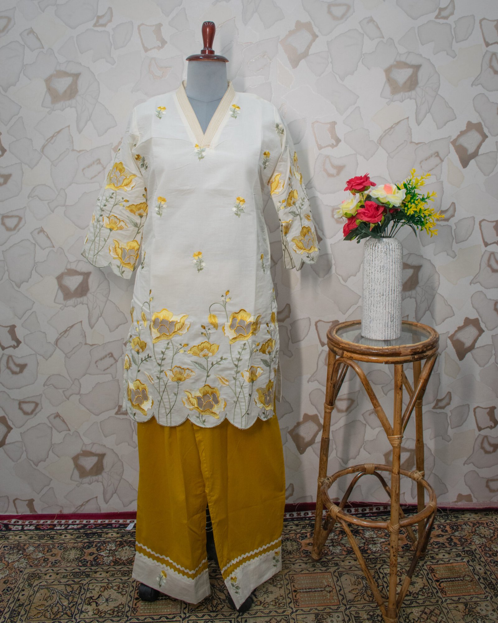 This vibrant top is paired perfectly with contrasting mustard yellow relaxed pants. To tie the whole look together seamlessly, the bottom hem of the pants features a matching ivory scalloped border, giving the entire outfit a highly cohesive and designer finish.