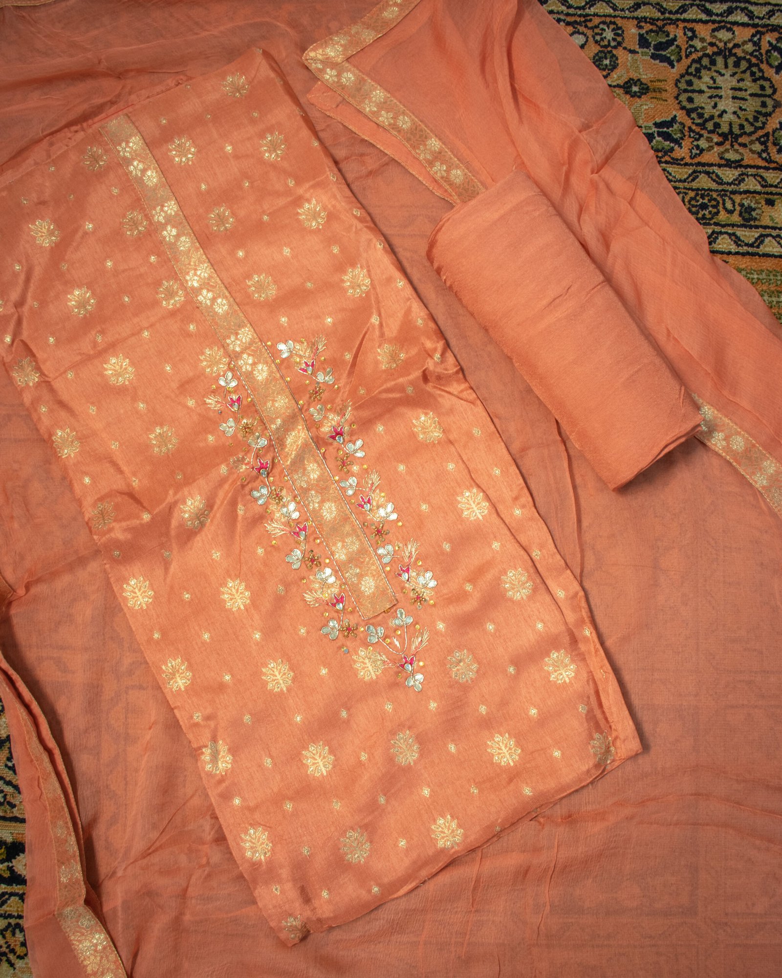 Complementing this rich top is a matching solid peach bottom fabric, offering you the creative freedom to tailor it into a sleek pair of straight pants, classic churidars, or comfortable wide-leg trousers. Tying this majestic look together is the flowing, lightweight dupatta, perfectly finished with a broad golden woven border that adds a final touch of traditional grandeur.